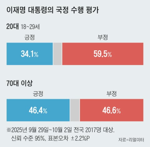 리얼미터가 에너지경제신문의 의뢰를 받아 지난 9월 29일부터 10월 2일까지 실시한 조사(전국 2017명 무선 자동 응답 조사 표본 오차 95% 신뢰 수준 ±2.2%P 응답률 4.9%, 자세한 사항은 조사 기관의 홈페이지 또는 중앙선거여론조사심의위원회 홈페이지에서 확인 가능)에서 ‘이재명 대통령의 국정 수행을 어떻게 평가하는지’ 물어보았다. 20대(18~29세)의 이 대통령 국정 수행 평가에서 긍정 34.1%, 부정 59.5%로 부정 우위가 뚜렷하게 관측된 반면, 70대에서는 긍정·부정이 거의 동률 수준으로 나왔다. 최근 조사 흐름에서는 20대가 상대적으로 더 비판적 태도를 보이는 패턴이 반복적으로 확인된다.