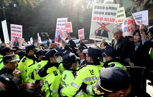 장 대표가 묘역으로 들어서려 하자, 시민단체 회원들은 ‘극우 선동 장동혁은 광주를 떠나라’라는 글이 쓰인 손팻말을 들고 장 대표의 참배 길을 막아섰다.