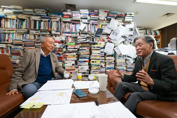 강천석(이하 강): “일본 특파원 시절 모은 책을 비롯해 1만권은 파주 컨테이너로 보내고, 얼마 전 80년대 책을 이삼천 권 버렸는데도 이 모양입니다.”