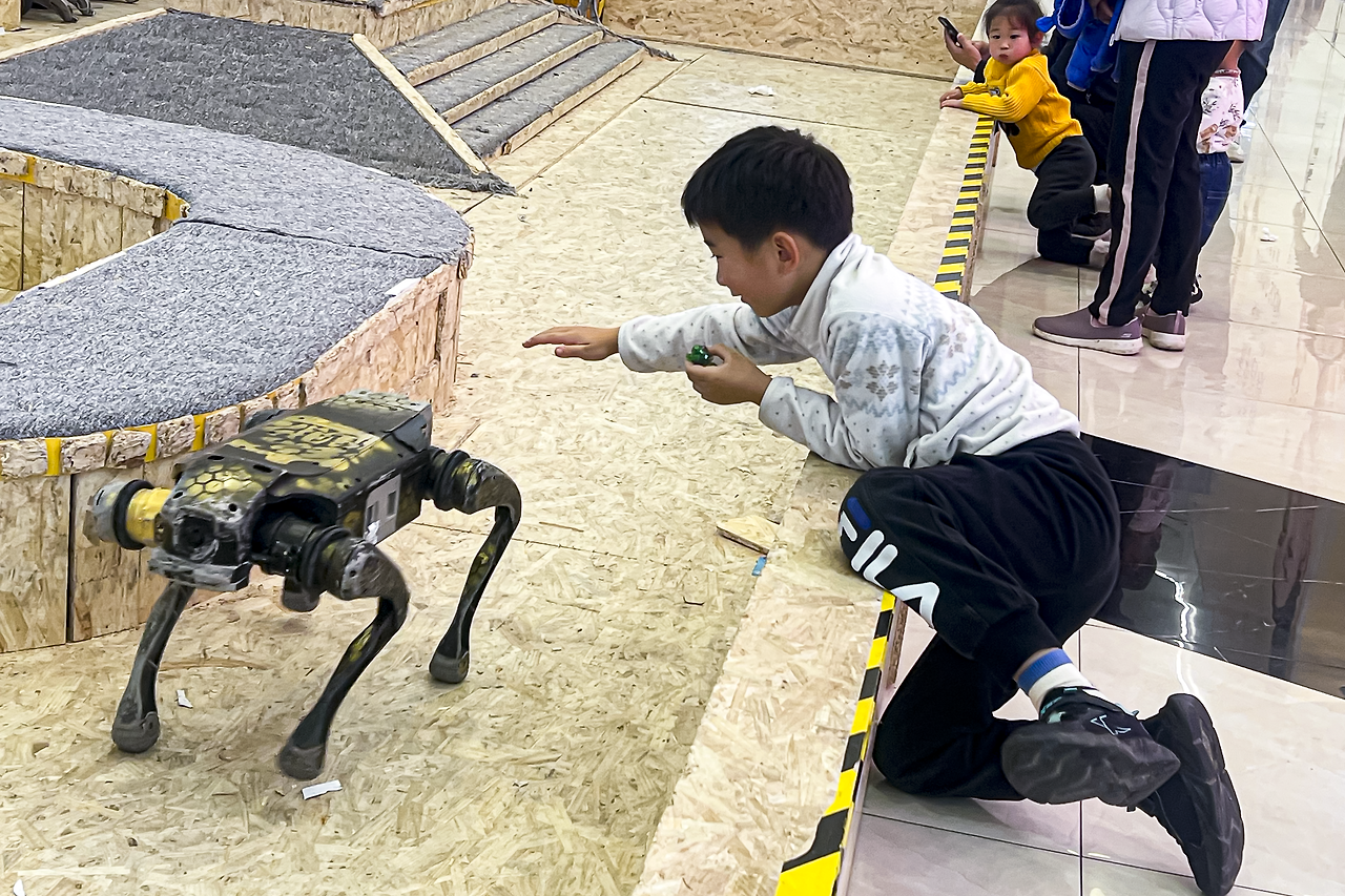 지난 9일 베이징 차오양구의 한 쇼핑몰 1층에 마련된 로봇개 체험장에 어린이들이 몰려 있다. 이 체험장에서는 88위안(약 1만8000원)을 내면 로봇개를 직접 조종할 수 있다. /베이징=이벌찬 특파원
