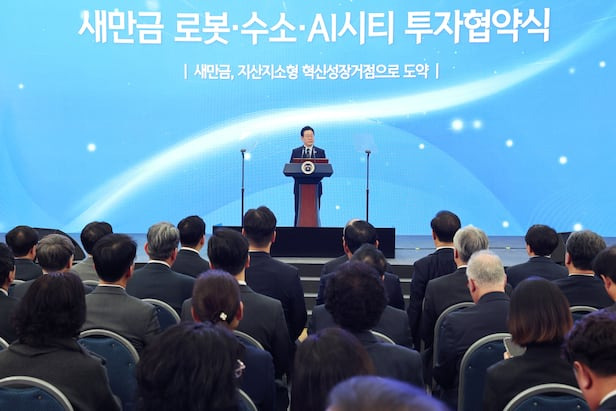 이어 “새만금의 바람과 햇빛은 친환경 그린 수소로 전환된다”며 “이러한 친환경 에너지를 바탕으로 글로벌 피지컬 AI를 선도할 대규모 로봇 제조 공장과 부품 클러스터, 그리고 AI 데이터센터가 새만금에 들어선다”고 했다. 그러면서 “새만금은 누구나 일상에서 로봇을 편리하게 사용하는 ‘미래 도시’로 거듭날 것”이라고 했다.