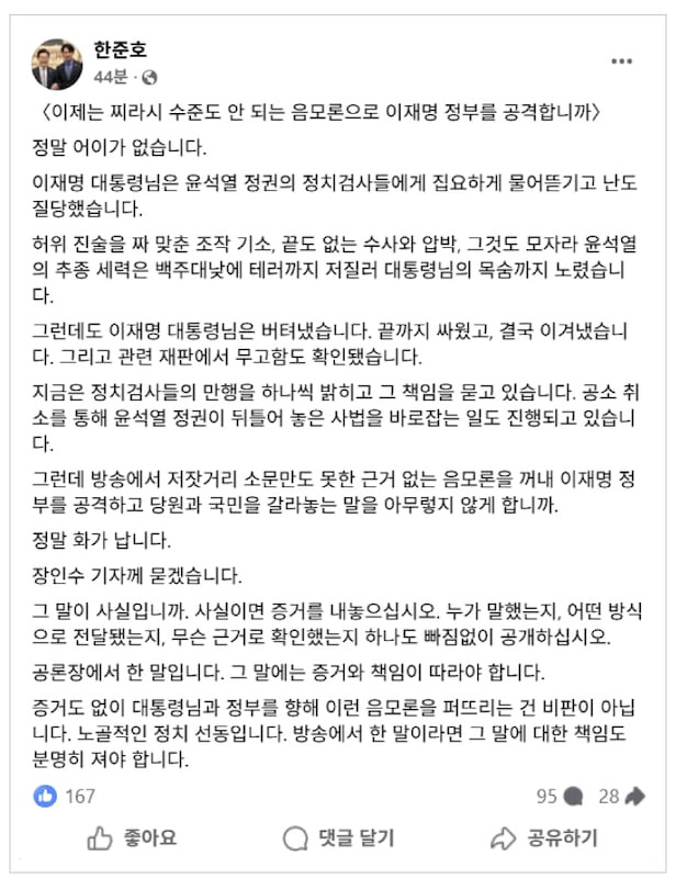 한 의원은 “그런데 방송에서 저잣거리 소문만도 못한 근거 없는 음모론을 꺼내 이재명 정부를 공격하고 당원과 국민을 갈라놓는 말을 아무렇지 않게 하느냐”면서 “정말 화가 난다”고 했다.