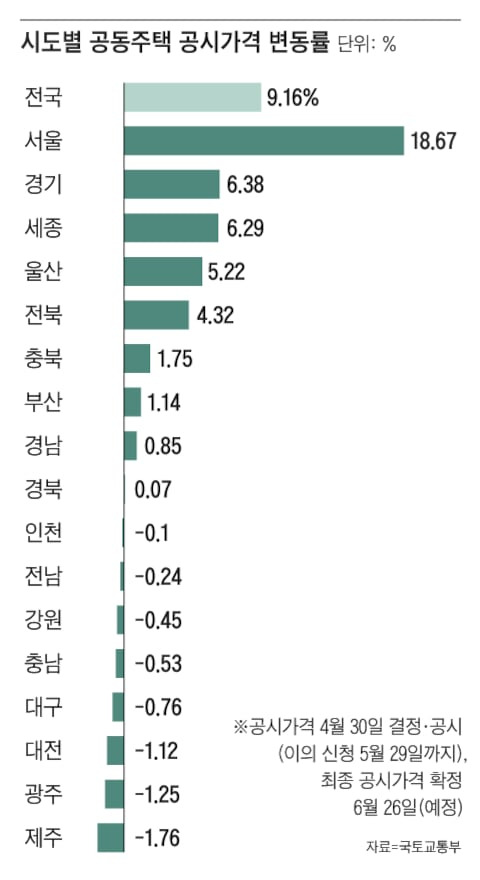 국토교통부는 17일 전국 공동주택(아파트·다세대·연립) 약 1585만호의 올해 1월 1일 기준 공시가격을 공개했다. 전국 공동주택 공시가격 상승률은 평균 9.16%로, 지난해(3.65%) 대비 5.51%포인트 오른 것으로 집계됐다. 전국 평균보다 공시 가격이 많이 오른 지역은 서울(18.67%)이 유일하다. 이어 경기(6.38%), 세종(6.29%), 울산(5.22%), 전북(4.32%) 등 순으로 올랐으며, 인천(-0.1%), 대전(-1.12%), 광주(-1.25%) 등은 하락했다. 공시가격은 보유세, 건강보험료, 기초연금 등 67개 조세·복지·행정 제도에 활용되는 지표로, 주택 시세에 현실화율을 곱해 산출된다.